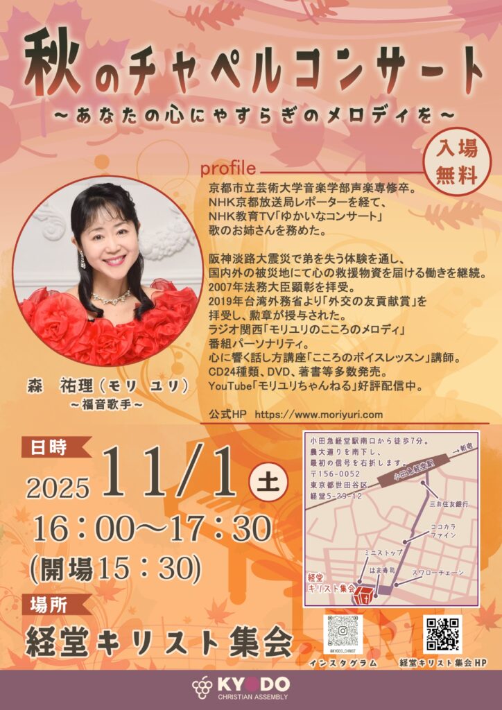 ◆日時:2025年11月1日(土) 開場15:30 開演16:00 ◆会場:経堂キリスト集会 ◆ゲスト:森 祐理さん(福音歌手)